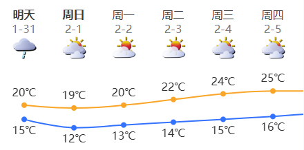 预计1月31日阴天,有小雨和轻雾,昼夜温差减小,气温15-20℃;