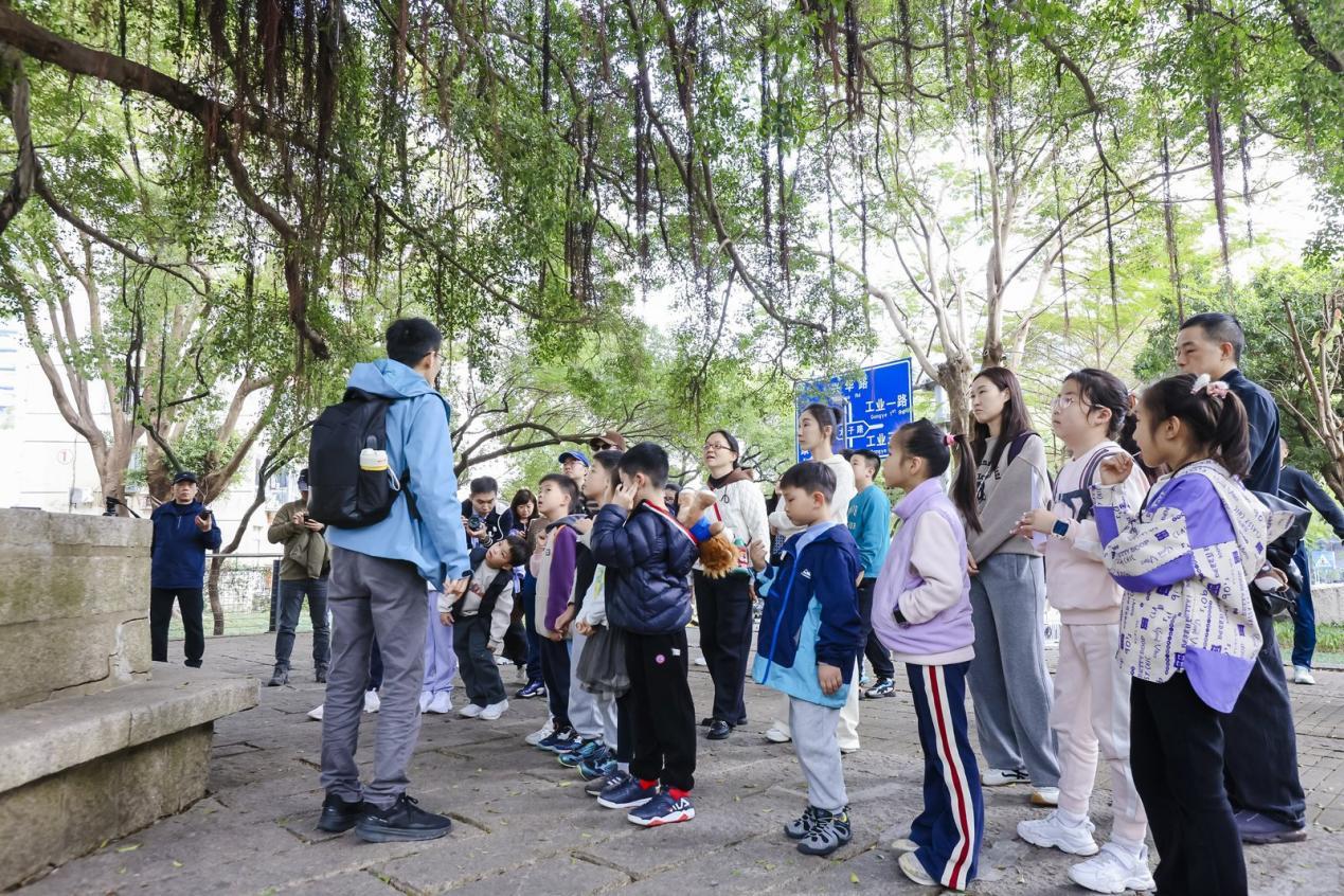 沿途行至爱榕路,马老师讲述了这段路背后的故事——20世纪80年代,蛇口工业区建设时,为保护两株古榕,建设者主动修改道路线型,让树得以保留,这就是“爱榕路”这一路名的来源。如今,这里已成为一条绵延1500米的绿意长廊。马老师引导大家思考,“它体现的是一种长远的眼光与对自然的尊重——短期的成本,换来了长期的生态价值、社区认同与品牌美誉。”孩子们望着巨大的树冠,对这份“可持续”的智慧有了更直观的感悟。