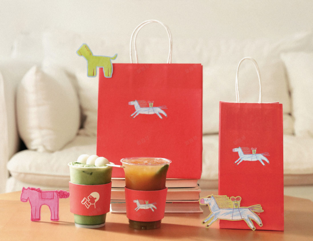 在活动中,喜茶邀请一直与“马”有不解之缘的马思纯创作了三幅不同形象的小马,并结合马思纯的手写祝福语,将其延展设计成为新春限定纸袋、杯套等包材,以及灵感小卡红包、冰箱贴、陶瓷杯、主题门店装饰等品牌周边活动。同时,通过主题店互动、DIY喜贴等特别活动,喜茶希望与马思纯一起邀请更多用户参与进来,以灵感创作的方式打开马年,开启新的自在旅程。
