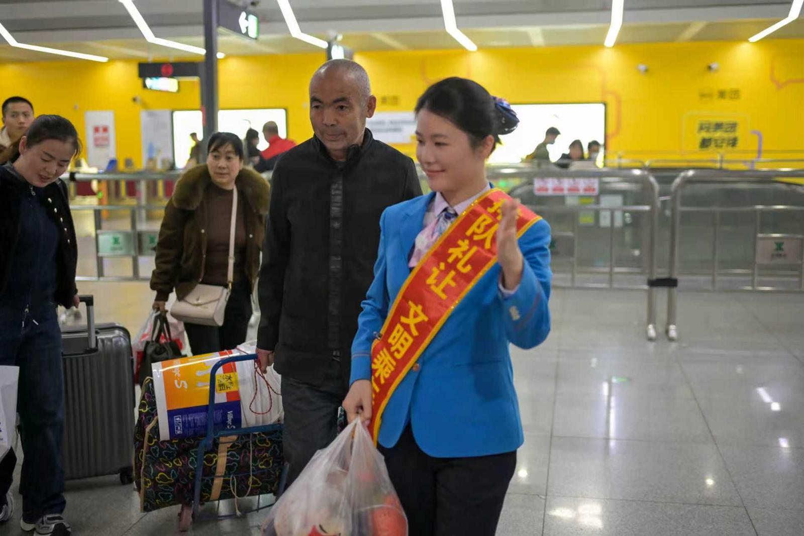 “您好,这边也可以通往深圳北高铁进站口”,车站现场,志愿者们有序引导乘客分流通行,科学疏解客流高峰;针对携带大件行李、老人、儿童及行动不便的旅客,志愿者们也主动上前,提供爱心接驳、行李搬运等一对一帮扶,打通乘客从地铁站前往火车站、高铁站、航站楼等换乘其他交通工具的“最后一公里”。