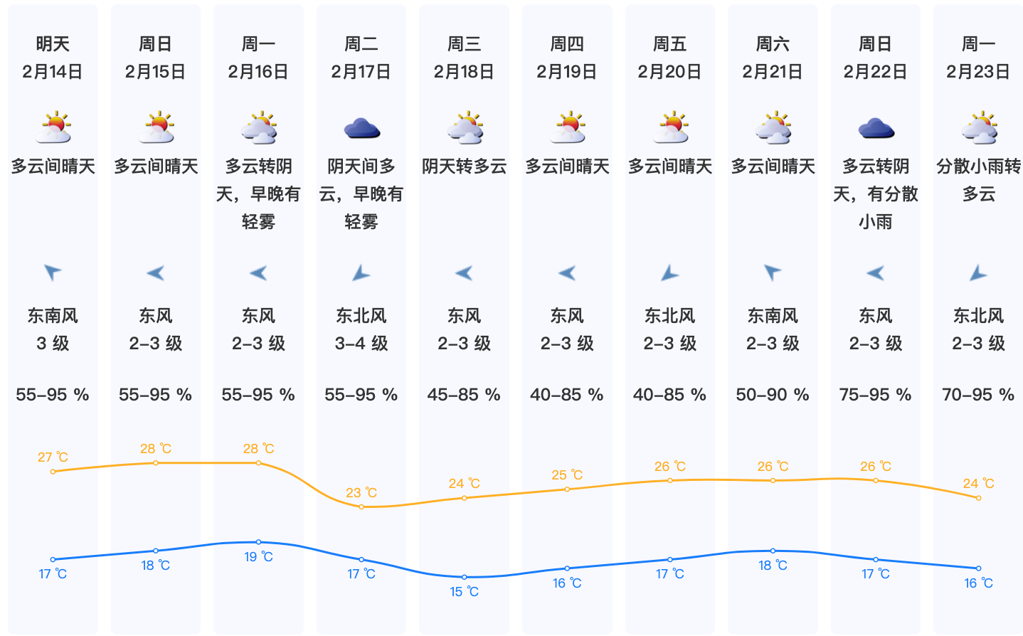 2月14-16日(节前至除夕):多云到晴天,天气逐日转暖,其中15-16日最高气温28℃左右;