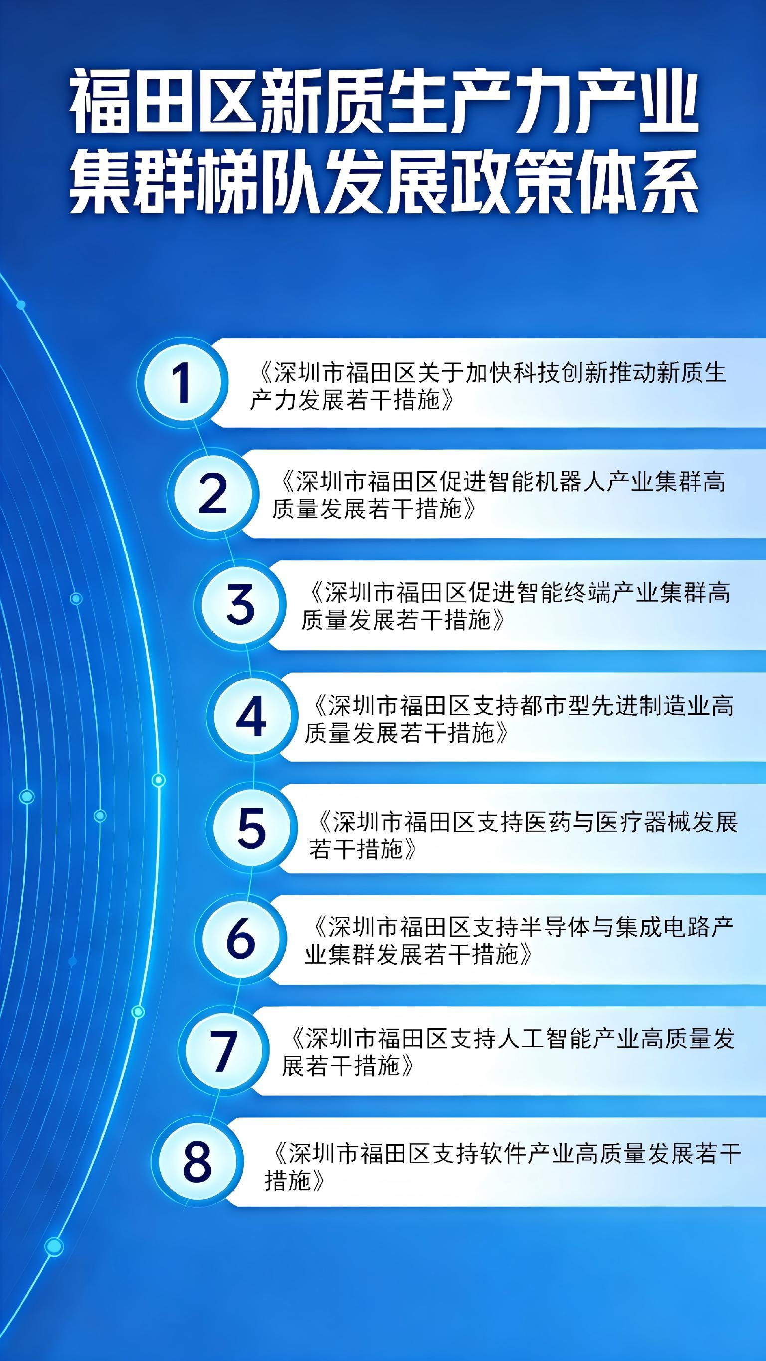 构建“1+N”政策体系,以《福田区加快科技创新推动新质生产力发展若干措施》为纲领性引领,配套出台智能终端、医药与医疗器械、智能机器人、都市型先进制造业等产业专项措施,实现重点领域全覆盖。
