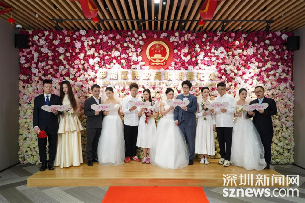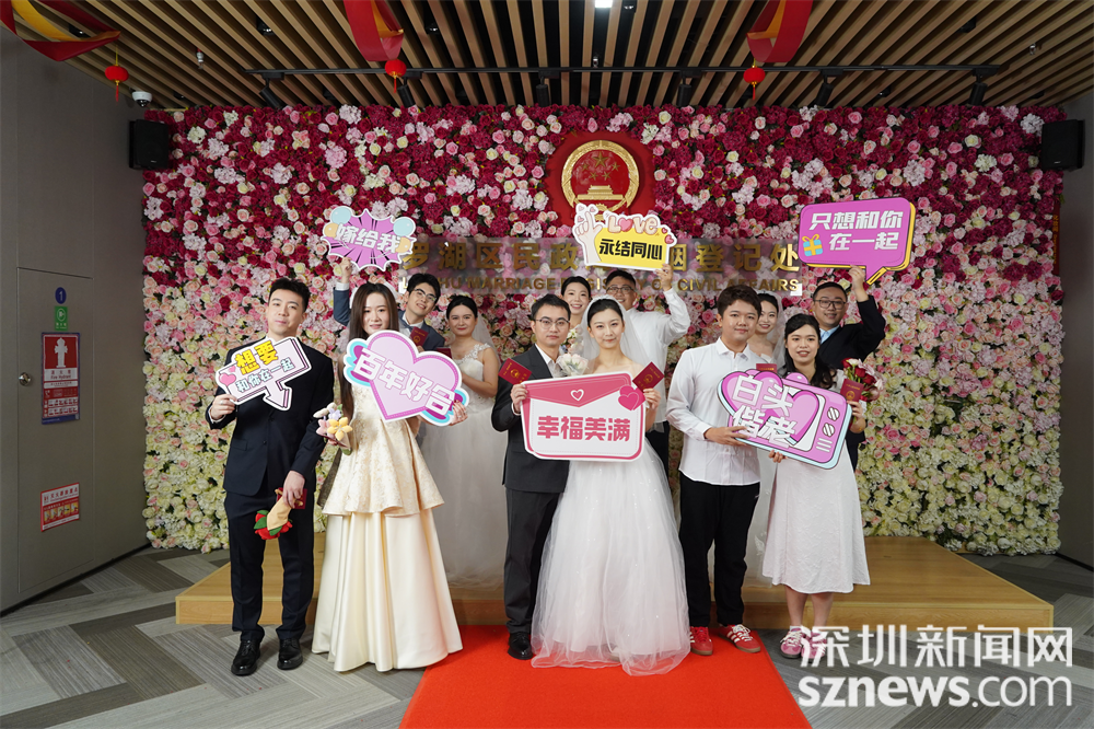 深圳新闻网2026年2月14日讯(记者 李慧)2月14日,春节前最后一个工作日,罗湖区民政局迎来结婚登记高峰,线上名额全部约满。清晨,当天最早的一对新人刚从飞机落地深圳便第一时间赶来登记处,盛装到达,拍照打卡,满怀激动地等待登记。随后,不少新人陆续到来,或头戴白纱着西式礼服,或身着马面裙展现中式浪漫,大家手挽伴侣,笑意盈盈。当天,登记处为6对新人举办了一场简约庄重的集体颁证仪式,以满满的仪式感送上新春祝福,以实际行动倡树文明婚俗新风。