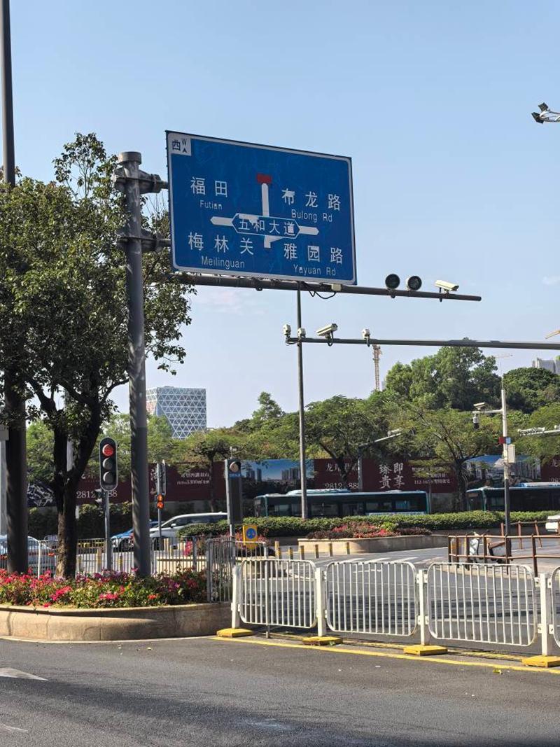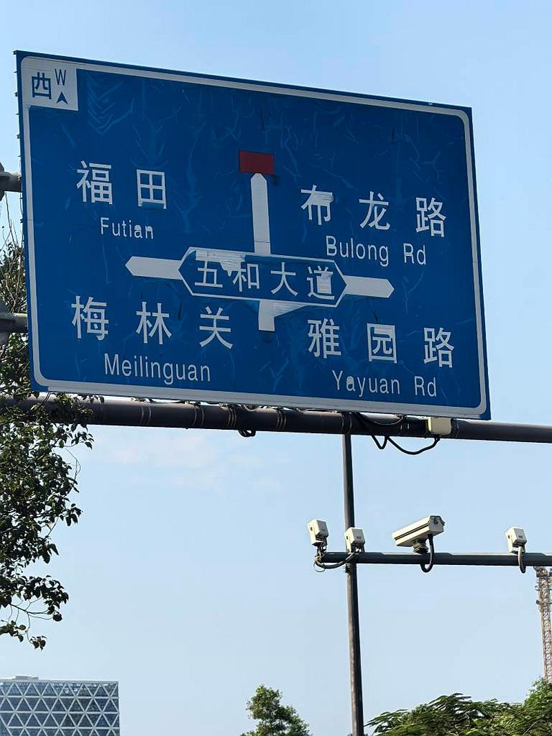 根据报料人提供的线索,记者来到了位于龙岗区坂田街道办路口,即五和大道与雅宝路交会处。在现场,记者看到了市民所反映的那块大型F杆道路指示牌。这块指示牌设置在路口东往西行的方向,主要指引前往五和大道方向的车辆。