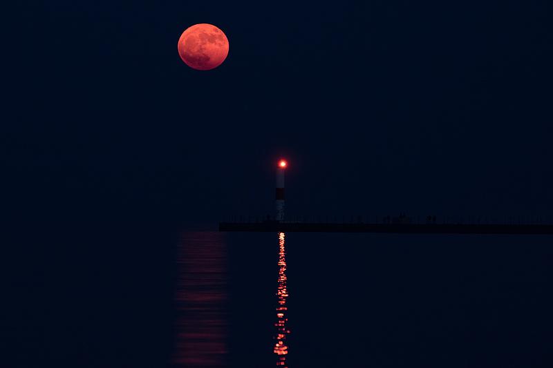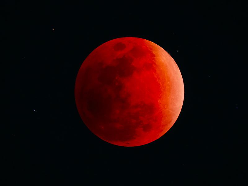 19时4分食既,月亮完全进入本影,红月亮取代了满月,夜空重归暗色,被满月光辉掩盖的恒星们也将一一显现。