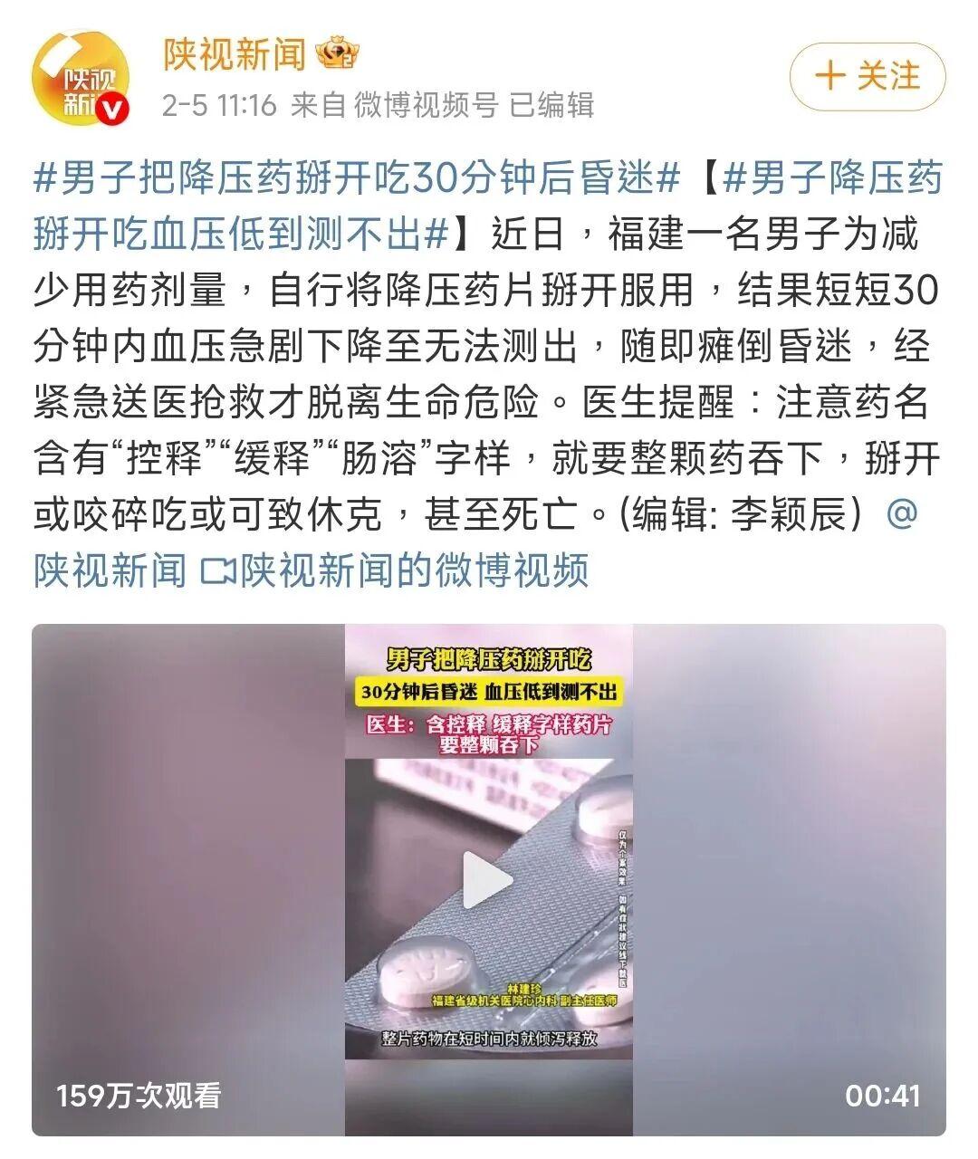 最近有个新闻,一男子将降压药掰开吃,半小时后昏迷,经紧急抢救后脱离生命危险。