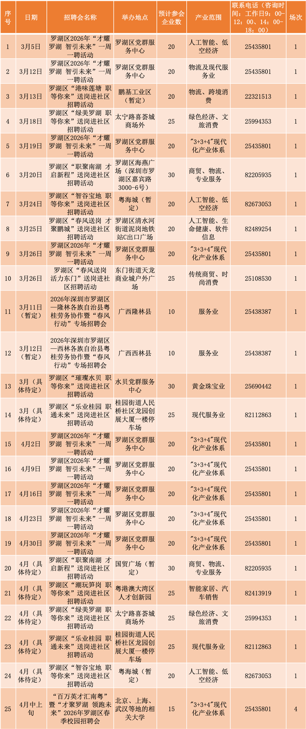 3月至4月期间,罗湖区将开展近30场现场公益性招聘活动,覆盖全区10个街道,同步推进区级专场、粤桂协作及校园招聘。