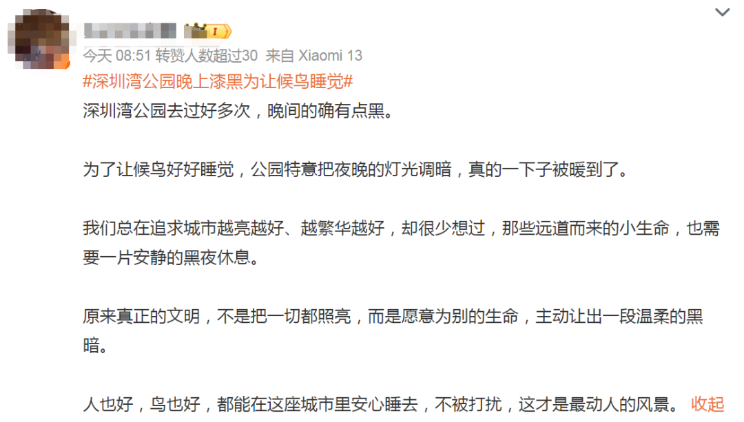 据介绍,深圳湾公园地处全球九大候鸟迁徙路线之一的东亚-澳大利西亚迁飞线中点,这片咸淡水交汇的湿地,是候鸟迁徙途中不可或缺的“补给站”,增设过多高亮度灯具,会破坏深圳湾的自然生态平衡,干扰候鸟的越冬栖息与迁飞节律。
