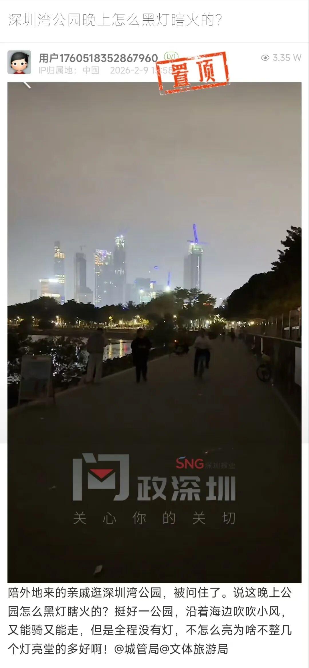 该网友表示,自己陪外地来的亲戚逛深圳湾公园时,被问住了。“晚上公园怎么黑漆漆的?这么好的公园,沿着海边吹吹风,又能骑车又能散步,但一路都没什么灯。为什么不装几盏亮一点的灯,让夜晚更亮堂一些呢?”