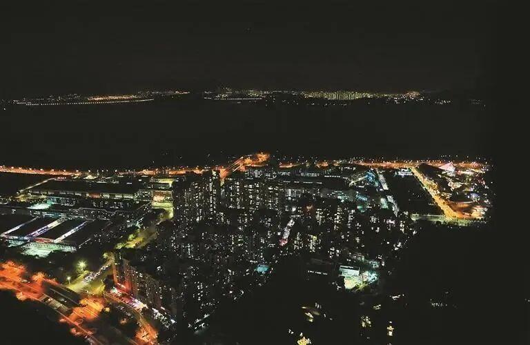 夜色中的深圳湾上空,远处的深圳湾公园进入“暗夜”。深圳晚报记者 李晶川 摄