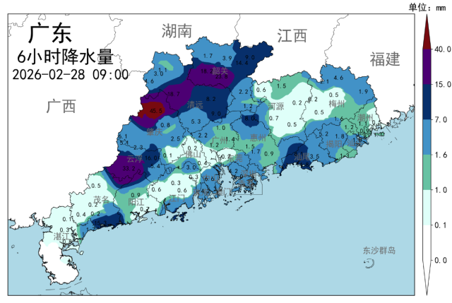 再从雨量监测上看,截至今日9时,6小时降水量统计上,云浮、肇庆、清远、韶关等地降雨量大。