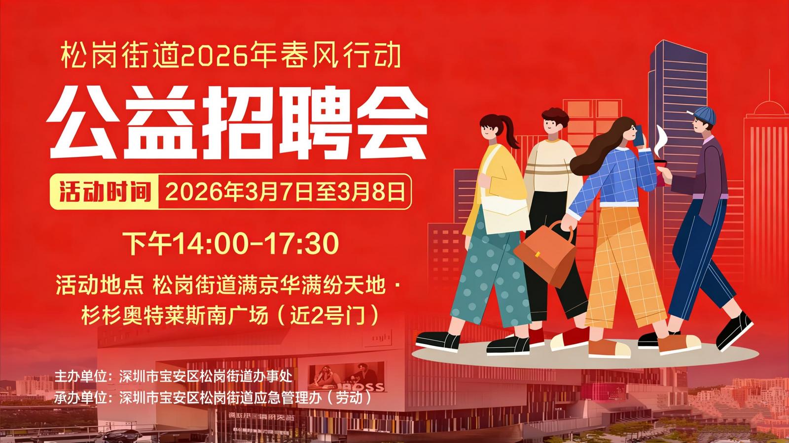 深圳新闻网2026年3月3日讯(记者 李小辉 通讯员 陈婉坚)为扎实做好稳就业、保用工、惠民生工作,松岗街道将于3月7日—3月8日,在满京华满纷天地・杉杉奥特莱斯举办2026年“春风行动”大型户外公益招聘会,连续两天为企业与求职者搭建高效对接平台,以优质公共就业服务助力辖区高质量发展。