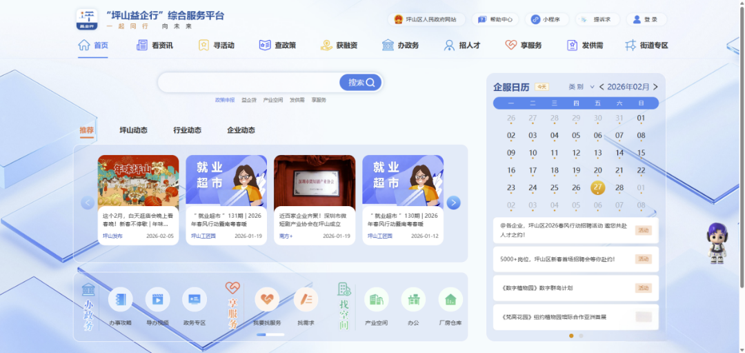 深圳新闻网2026年3月3日讯(记者 曹园芳)企业家的日常,往往在密集的会议、项目奔波、政策研读与报表处理中无缝切换。为了给这些经济发展的“赶路人”提供最强辅助,深圳坪山区近日正式上线“坪山益企行”小程序。这款因企而生的智慧化工具,通过整合全区涉企资源,构建起“1个区级平台、6个街道专区、N个特色专区”的服务矩阵,让企业只需手机“点单”,便能在线下“链上坪山”帮找市场、一站式办齐业务的基础上,实现政务办事的“秒问妙答”与“马上办妥”。