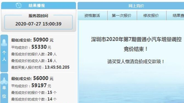 2020年第7期深圳市小汽车增量指标竞价顺利结束,个人竞价最低成交价为50900元。