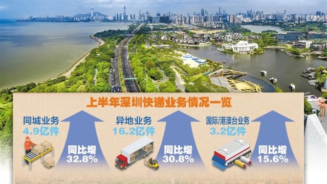 今年1-6月,全市快递服务企业业务量累计完成24.2亿件,同比增长29.0%;业务收入累计完成307.9亿元,同比增长21.2%。