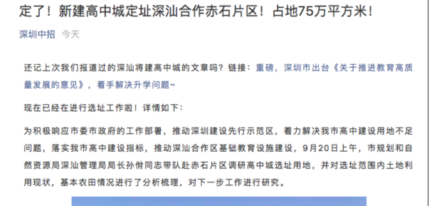 当天晚上,市规划和自然资源局官方回应称网文报道失实。并指出深圳规划了4处高中城用地,其中3处在深圳特区,1处在深汕特别合作区。