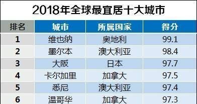 排在全球宜居城市前十位的是:奥地利维也纳,澳大利亚墨尔本,日本大阪,加拿大卡尔加里,澳大利亚悉尼,加拿大温哥华,加拿大多伦多,日本东京,丹麦哥本哈根,澳大利亚阿得雷德。