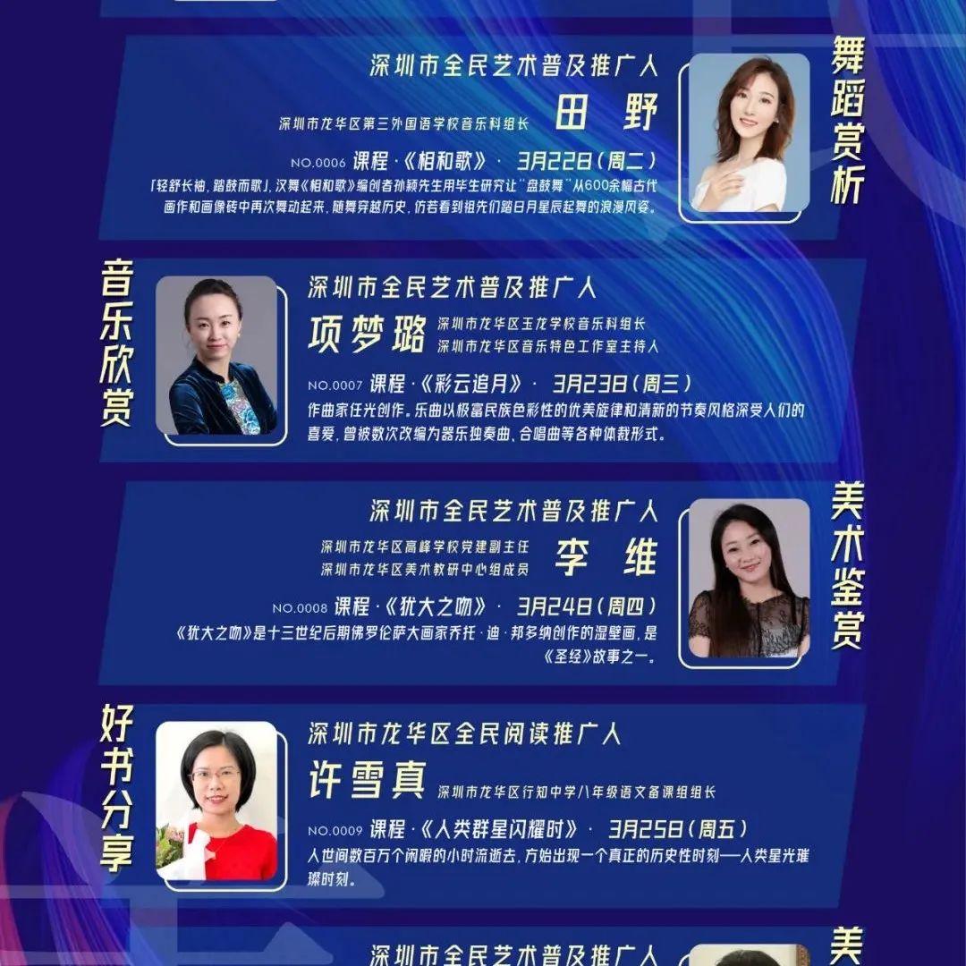 为促进市民美育的全面和谐发展,深圳市文化广电旅游体育局指导,深圳市龙华区文化广电旅游体育局、深圳市龙华区教育局和深圳市文化馆联合主办,龙华区教育科学研究院和龙华区文化体育发展中心联合打造的全民美育大课堂于2022年3月17日全市上线。本次活动作为一个长期项目,每天邀请一位优秀导师为市民带来精彩的线 ...