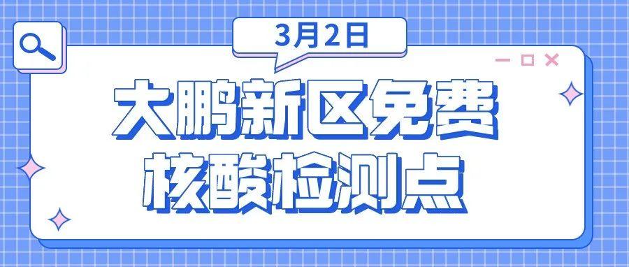 3月2日大鹏新区免费核酸检测点安排请居民朋友们查收~大鹏新区免费核酸检测点一览表(3月2日)备注 如检测安排有变化,请以街道或社区通知为准。一、采样前 1.接种新冠病毒疫苗后,需间隔48小时方可进行核酸检测。3.全程正确佩戴口罩,排队时保持1米距离,避免聚集和相互交谈