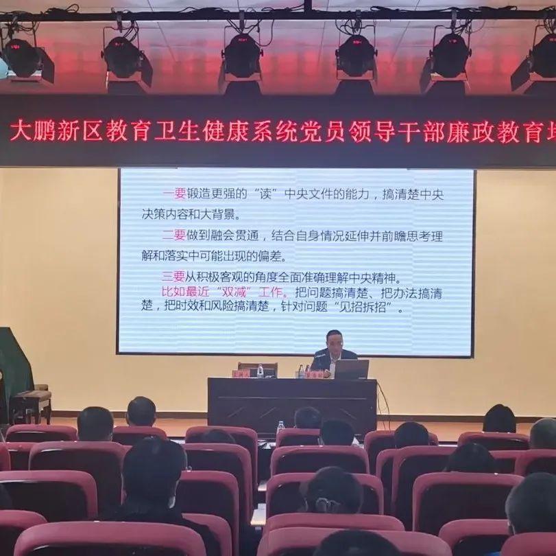 为深入学习贯彻习近平新时代中国特色社会主义思想,推动全面从严治党向纵深发展,深化党风廉政建设,强化廉洁自律意识,进一步增强广大党员领导干部防腐拒变能力。近日,大鹏新区教育卫生党委举办了新区教育卫生健康系统党员领导干部廉政教育培训班,特邀市纪委监委派驻第十一纪检监察组三级调研员蓝浩铭授课。新区教育卫 ...