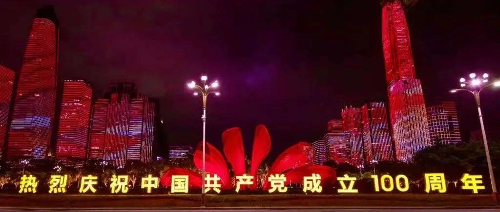 “七一”前夕庆祝建党百年主题标识随处可见市民中心广场装点一新深南大道花团锦簇各大楼宇间“满屏”飘动祝福深圳处