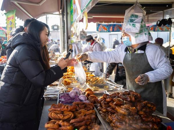 “呲溜”一下,软糯的糖糕滑入油锅,淡淡的香甜缓缓充满鼻腔;刚出锅的炸酸奶金黄酥脆,每一次咀嚼都唇齿留香;“砰砰砰”的连声爆响中,新鲜出炉的爆米花散发着清甜的玉米香,挑动着食客味蕾……摊主的叫卖声、顾客的询价声、电子支付到账声,声声入耳,闹热了冬日里的金贵集市。
