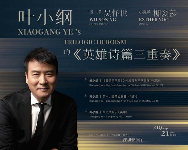 9月21日周日20:00,深圳交响乐团将在深圳音乐厅举办“吴怀世×柳爱莎|叶小钢的英雄诗篇三重奏”音乐会。