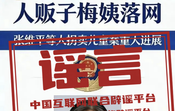 近日,广州警方宣布“张维平拐卖儿童案”关键人物“梅姨”(谢某某)落网。不久后,一张标有警徽、配着所谓落网“梅姨”照片的图片在网络流传。经核查,该网传图片并非警方发布,所谓的“梅姨”照片为虚假照片。