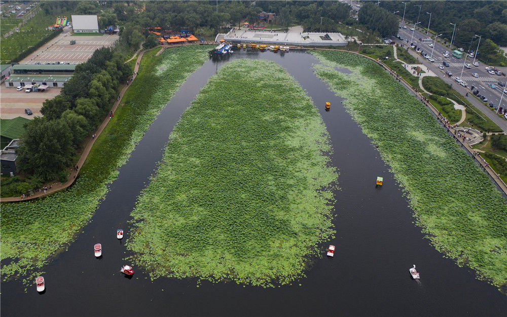 2019年7月13日,雨过天晴,沈阳荷花进入了最佳观赏期,航拍位于沈阳东陵公园南的百亩荷花池,湖面上波光粼粼,游船徜徉荷花丛。蔡靖宇/视觉中国