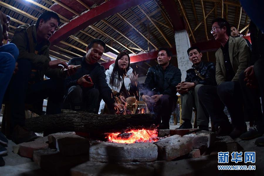 龙革雄(左二)和回家开办农家乐的村民商量相关事宜(2017年2月25日摄)。 新华社记者 黄孝邦 摄