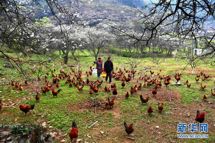 龙革雄(右)和妻子罗桂枝去喂鸡(2017年2月28日摄)。新华社记者 黄孝邦 摄
