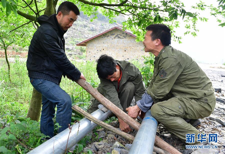 龙革雄(右)和堂兄弟们在架设引水管道(2017年4月7日摄)。新华社记者 黄孝邦 摄
