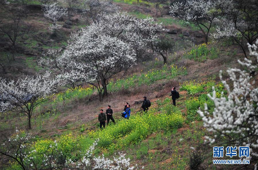 龙革雄(左二)带着游客在铜板屯赏花(2014年2月21日摄)。新华社记者 黄孝邦 摄