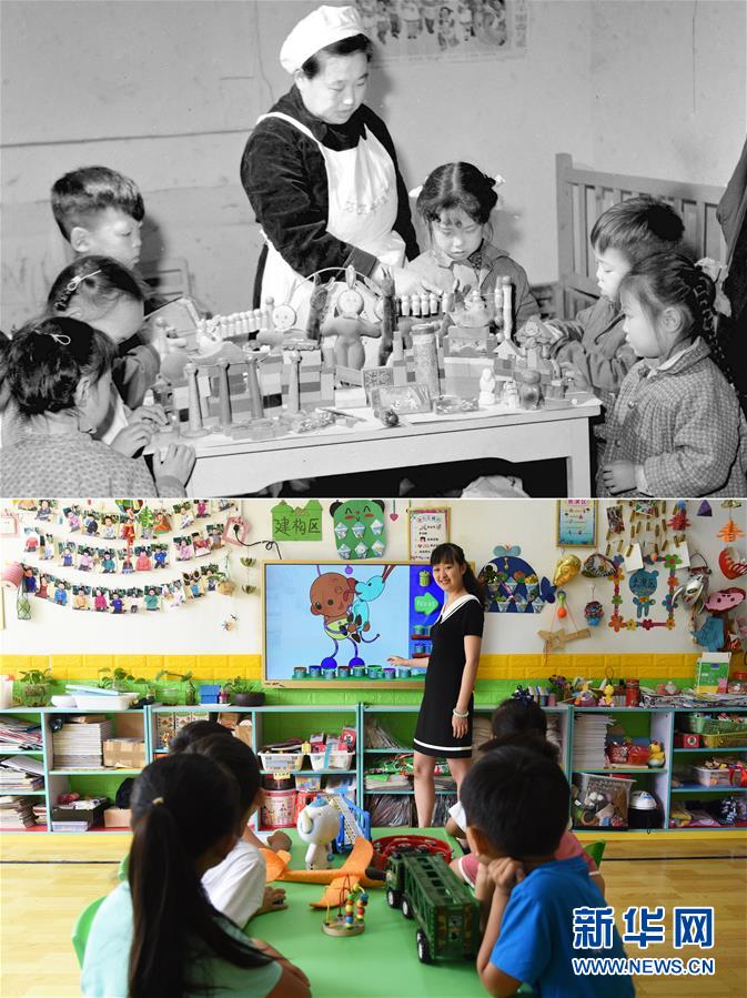 拼版照片:上图为上世纪60年代,天津市和平区兴安路的一家幼儿园内,孩子们在保育员的看护下做游戏(新华社记者田明摄);下图为2019年7月8日,济南智慧苑幼儿园老师曹斐然(后)通过多媒体网络信息化教学平台给学生上课(新华社记者王凯摄)。