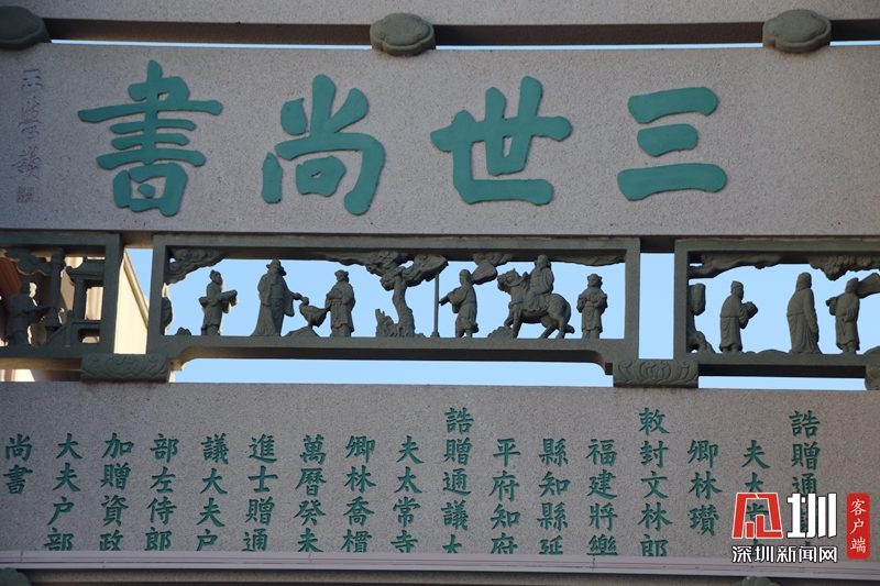 牌坊上的字和精细的雕刻。