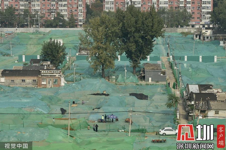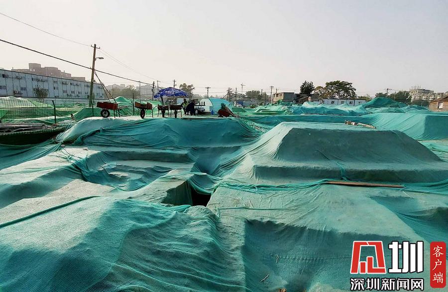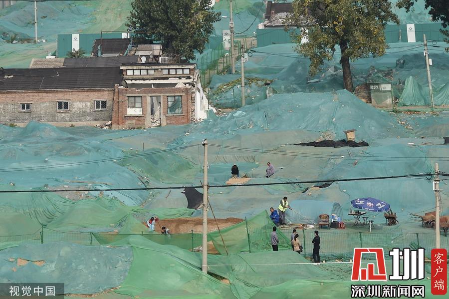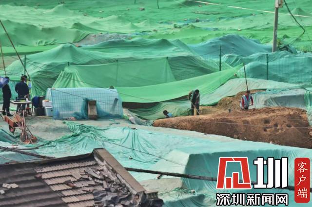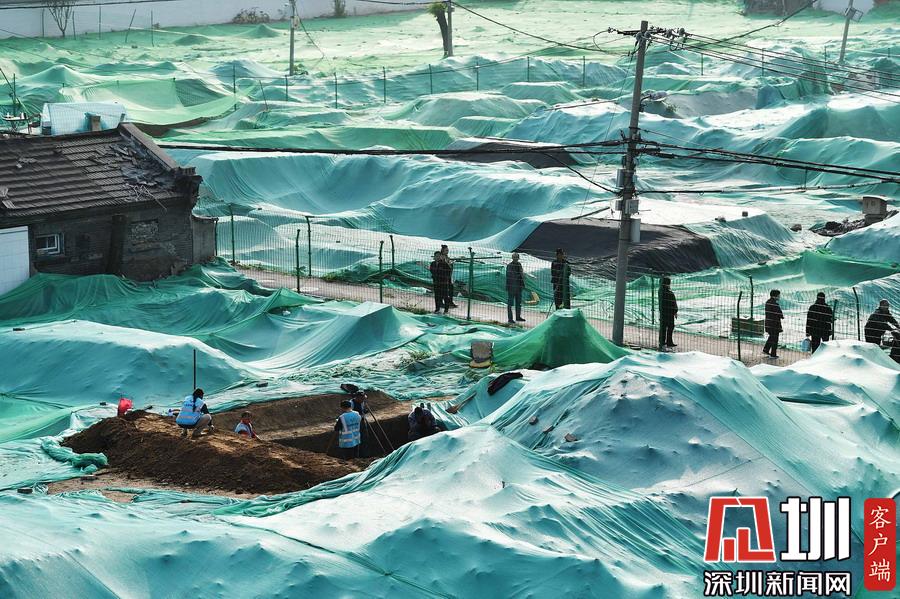 围挡内,工地大部分被绿色苫布覆盖,只露出几处规整的探坑。考古工作者正在紧张忙碌中,有些工作人员戴着草帽,坐在马扎上记录发掘细节,还有一些穿着蓝色背心的工作人员使用工具正在做清理工作。