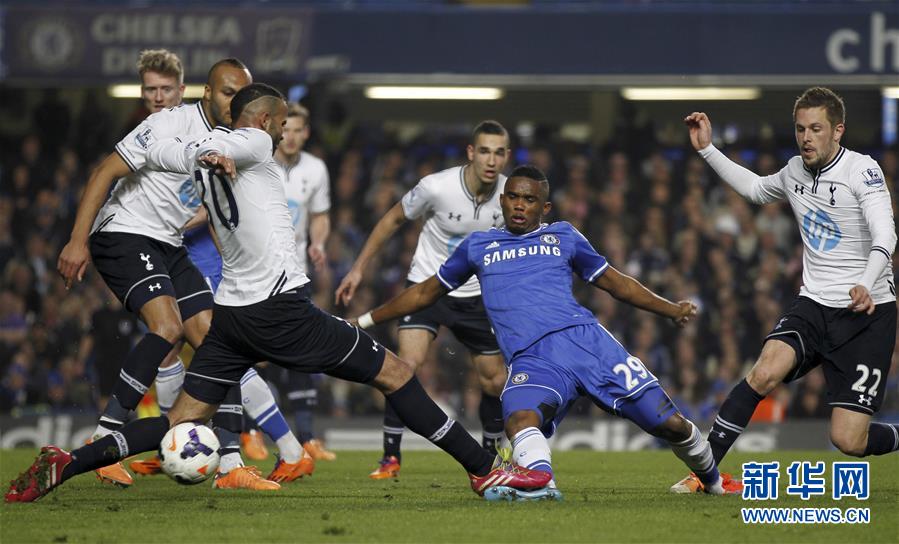 图为2014年3月8日,切尔西队球员埃托奥(右二)在2013-2014赛季英超第29轮主场迎战托特纳姆热刺队的比赛中突破防守。新华社记者王丽莉摄