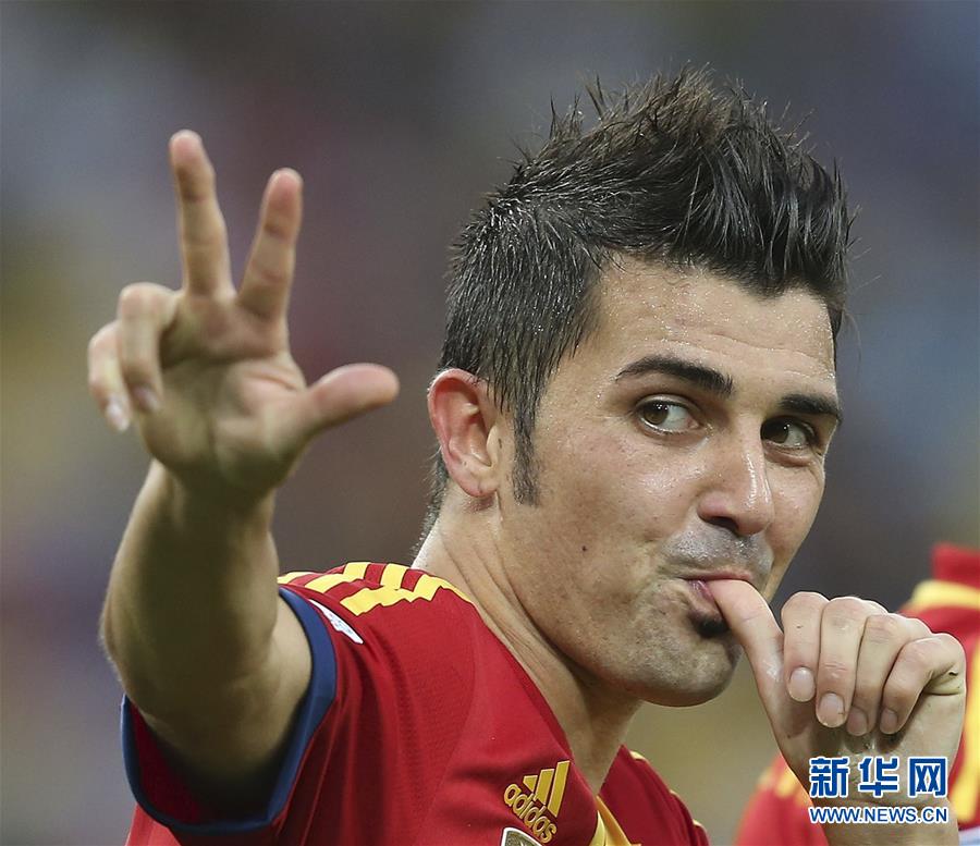图为2013年6月20日,在在2013年联合会杯足球赛B组对塔希提队的小组赛中,西班牙队球员比利亚庆祝进球。新华社记者廖宇杰摄