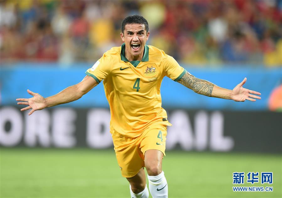 图为2014年6月13日,在2014年巴西世界杯小组赛B组与智利队的比赛中,澳大利亚队球员蒂姆·卡希尔庆祝进球。新华社记者刘大伟摄