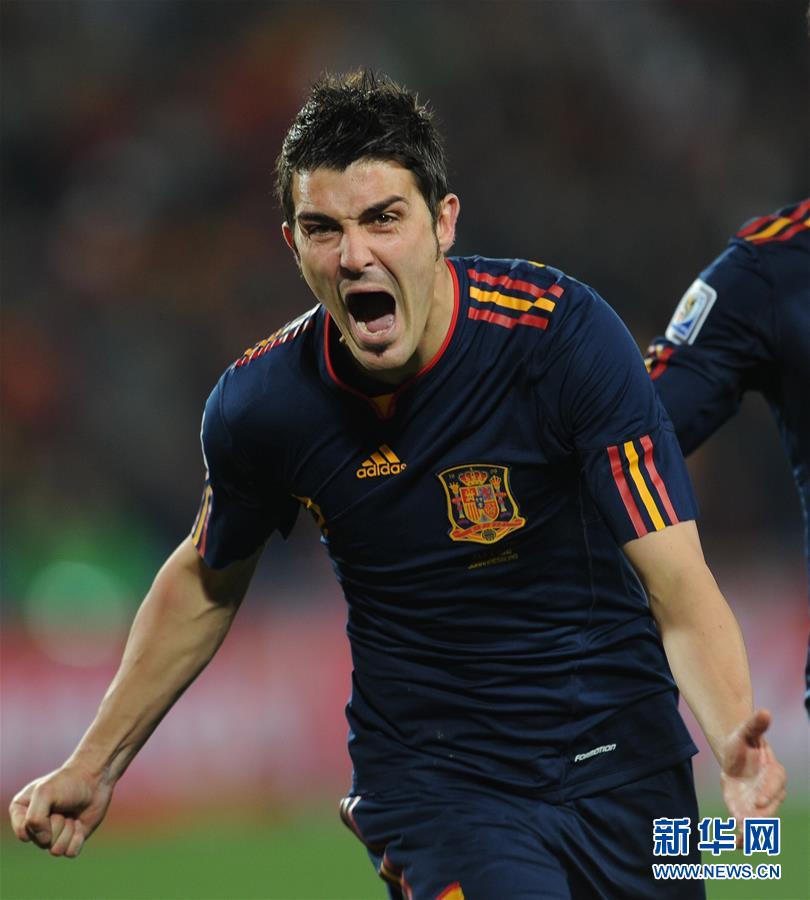图为2010年7月3日,在与巴拉圭队的2010南非世界杯四分之一决赛中,西班牙队球员比利亚在比赛中庆祝进球。新华社记者王毓国摄