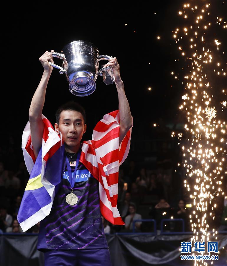 图为2017年3月12日,在全英羽毛球公开赛男子单打颁奖仪式上,李宗伟高举奖杯。新华社记者韩岩摄