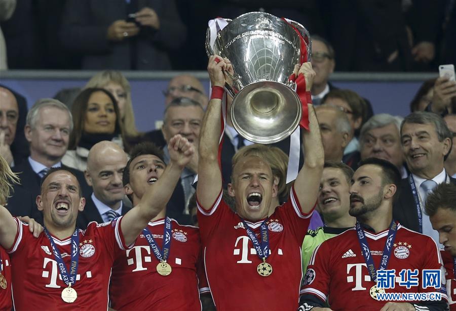 图为2013年5月25日,拜仁慕尼黑队球员罗本(中)在2012-2013赛季欧洲足球冠军联赛决赛颁奖仪式上举杯庆祝。新华社记者王丽莉摄