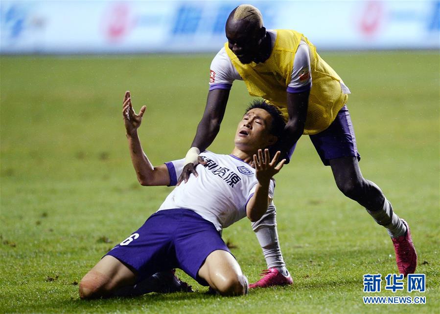 图为2016年8月13日,在2016赛季中超联赛第22轮客场挑战石家庄永昌队的比赛中,天津泰达队球员曹阳(下)庆祝进球。新华社记者王晓摄