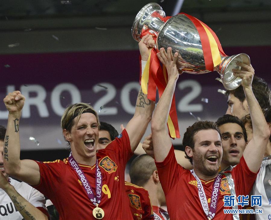 图为2012年7月1日,在乌克兰基辅奥林匹克体育场进行的2012欧洲足球锦标赛决赛中,西班牙队以4比0战胜意大利队,夺得冠军。这是西班牙队球员托雷斯(左)、马塔(中)、拉莫斯在颁奖仪式上举杯庆祝。新华社记者马宁摄