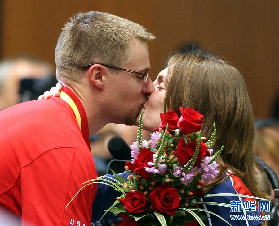 图为2008年8月9日,埃蒙斯(左)在北京奥运会上祝贺获得女子10米气步枪金牌的妻子卡捷琳娜。新华社记者姚大伟摄
