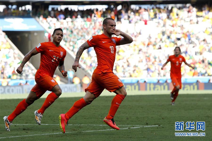 图为2014年6月29日,在与墨西哥队的2014年巴西世界杯八分之一决赛中,荷兰队球员斯内德(中)在破门得分后庆祝。新华社记者周磊摄
