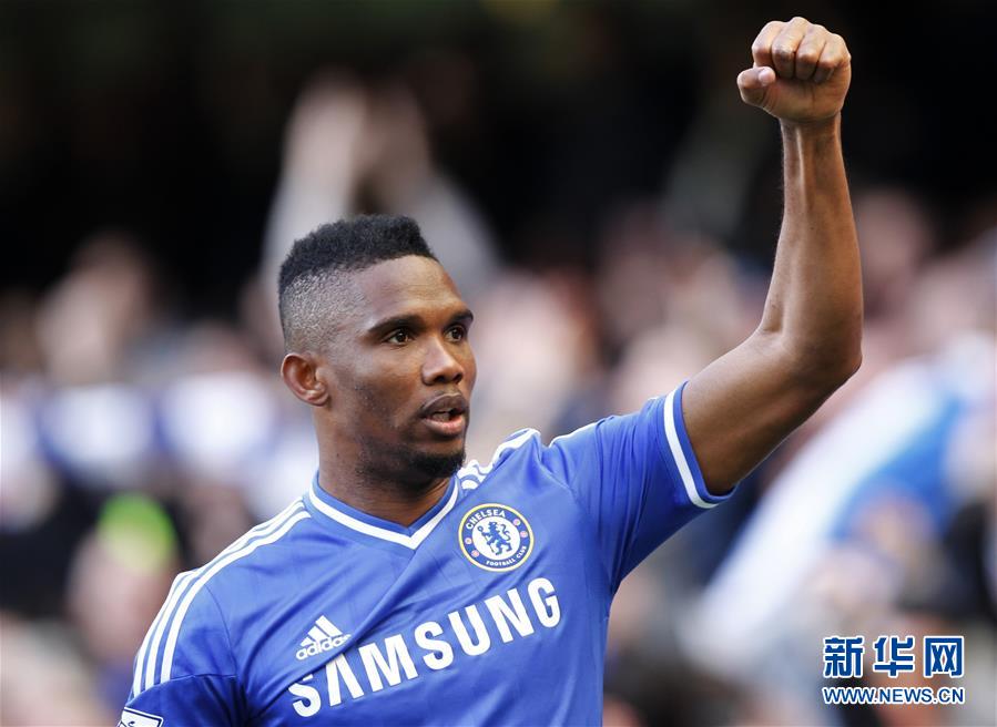 图为2014年3月22日,切尔西队球员埃托奥在2013-2014赛季英超第31轮主场迎战阿森纳队的比赛中庆祝队友许尔勒的进球。新华社记者王丽莉摄