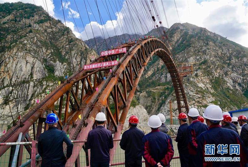 9月28日拍摄的川藏铁路拉林段重点标志性工程藏木特大桥合龙仪式现场。 当日,随着最后一节钢管拱的对位和锁定完毕,川藏铁路拉林段藏木特大桥成功合龙,标志着大桥主体结构施工取得了关键性胜利。藏木特大桥由中国中铁广州局集团承建,拱高112米,桥横跨雅鲁藏布江峡谷,水深66米。 新华社记者普布扎西摄