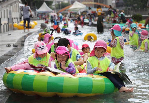 当地时间2018年7月24日,韩国首尔市松坡区城内川边,小朋友们在泡脚读书。近日首尔连日高温,松坡区政府在城内川水上乐园开设书吧,让孩子们戏水读书两不误。