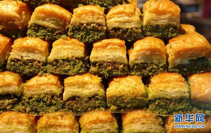 这是8月18日在土耳其伊斯坦布尔塔克西姆广场的一家甜品店拍摄的“巴克拉瓦”。果仁蜜饼“巴克拉瓦”是土耳其民众最喜爱的传统甜点之一。“巴克拉瓦”用糖浆或蜂蜜调味,中部是切碎的果仁,上下是多层用油脂起酥的酥皮,有方形、菱形和三角形,吃下去口感酥松香脆、甜蜜芬芳。在土耳其,售卖“巴克拉瓦”的店铺遍布各个城市。无论是作为庆祝节日的盛宴上的佳肴,还是作为午后小憩的茶点,“巴克拉瓦”都深受民众欢迎。新华社记者徐速绘摄